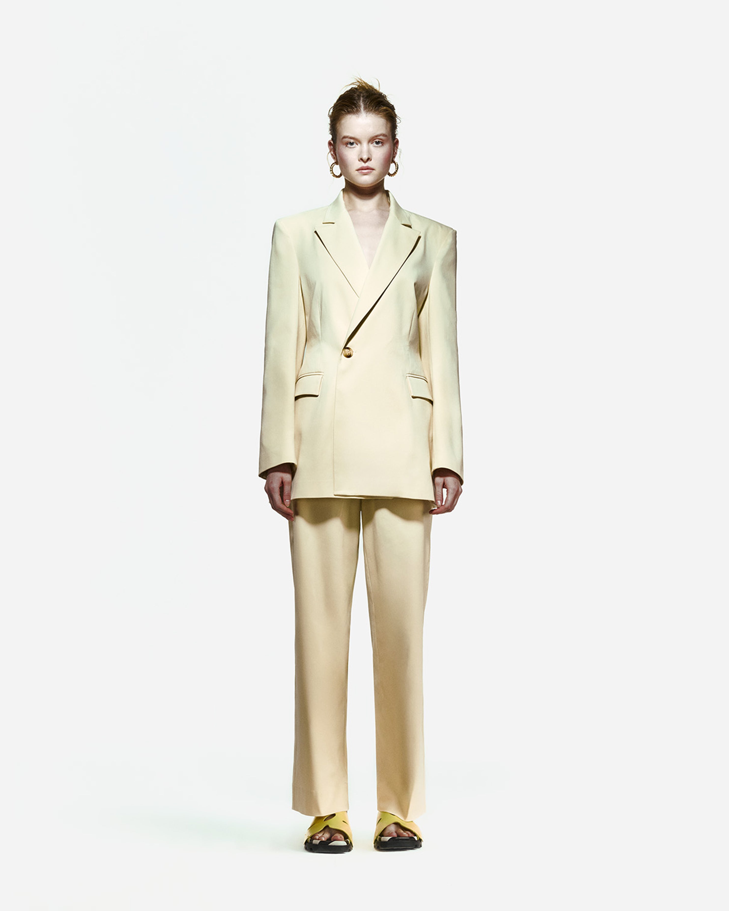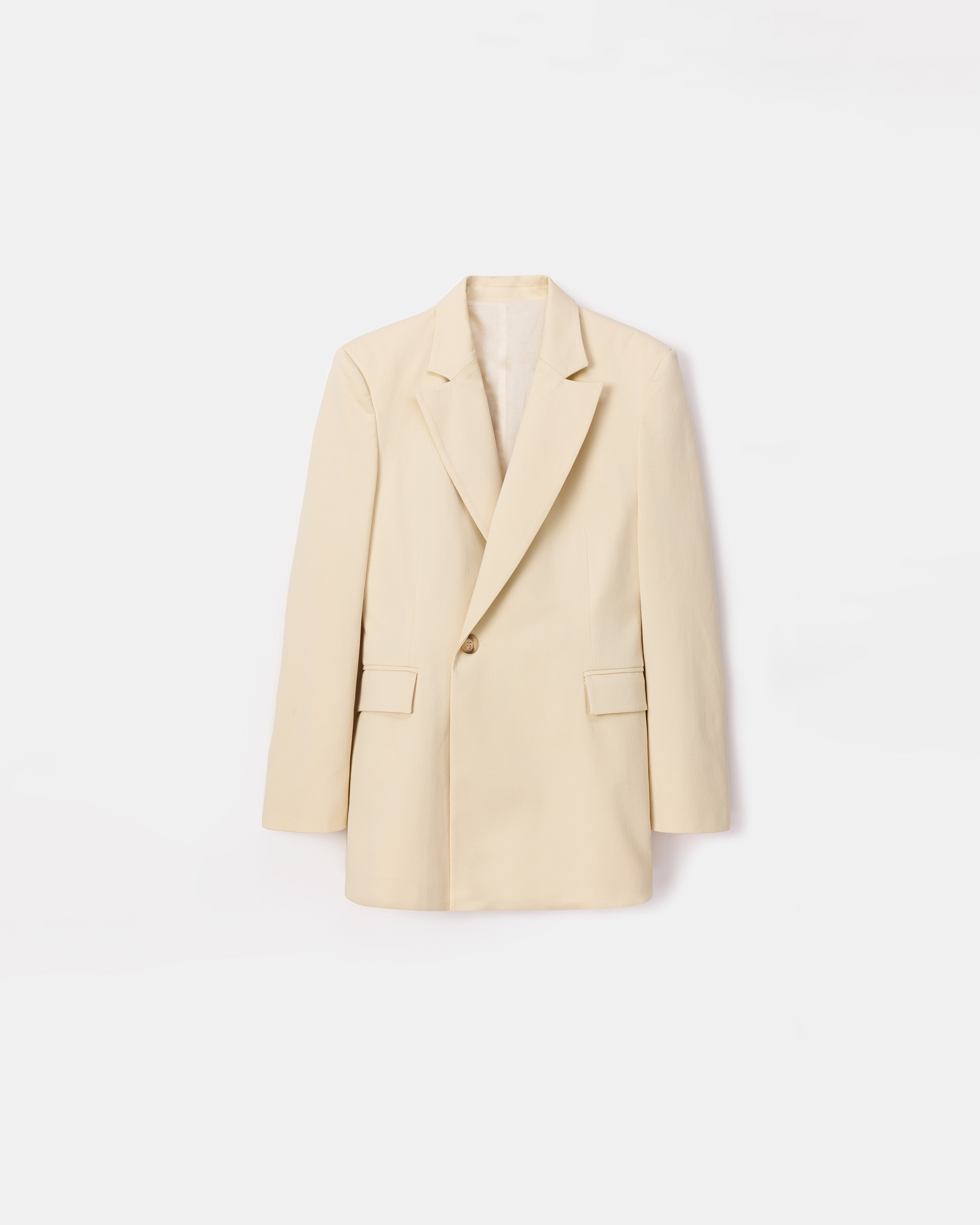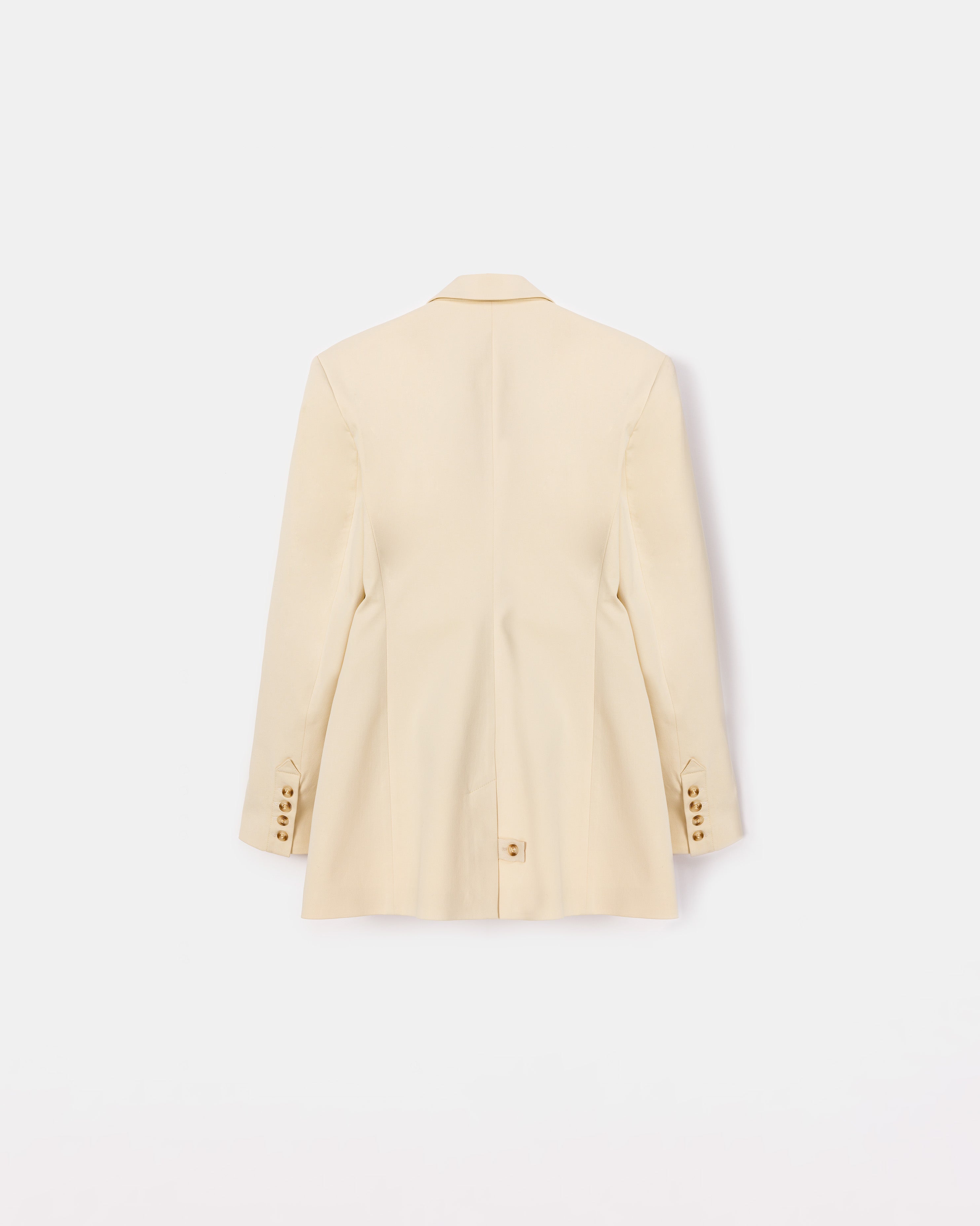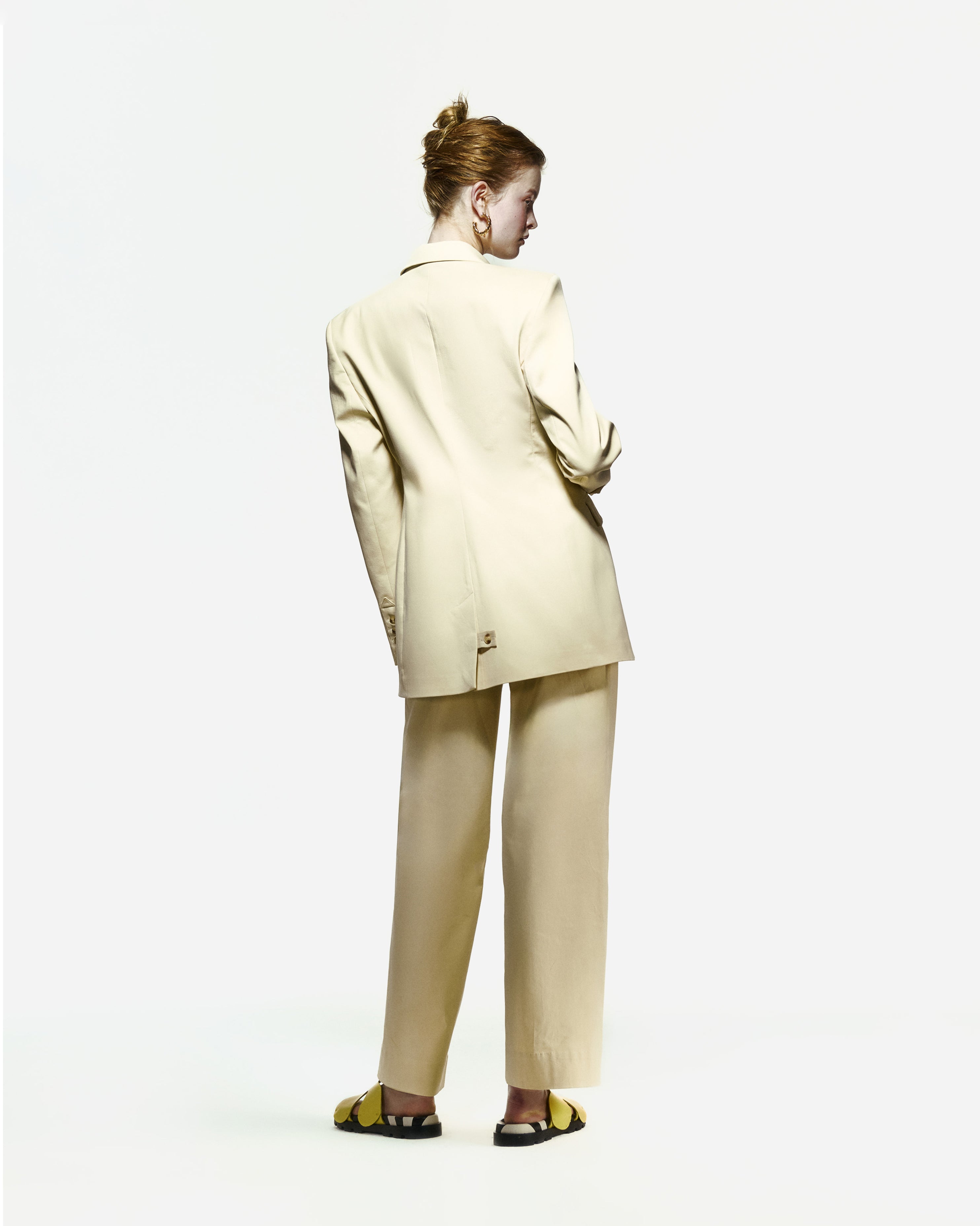 Mevsimlik pamuklu kumaştan yapılmış, yanları oyuklu bir kruvaze ceket. Asimetrik yan kapama, çift cep ve hafif omuz vatkası bulunmaktadır. İçerisindeki pamuk astarı sayesinde sıcak havalarda dahi rahatsız etmez.