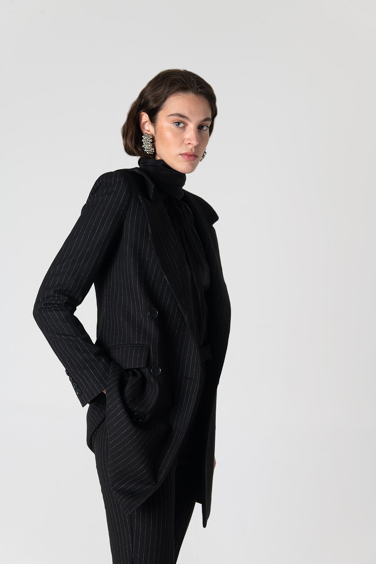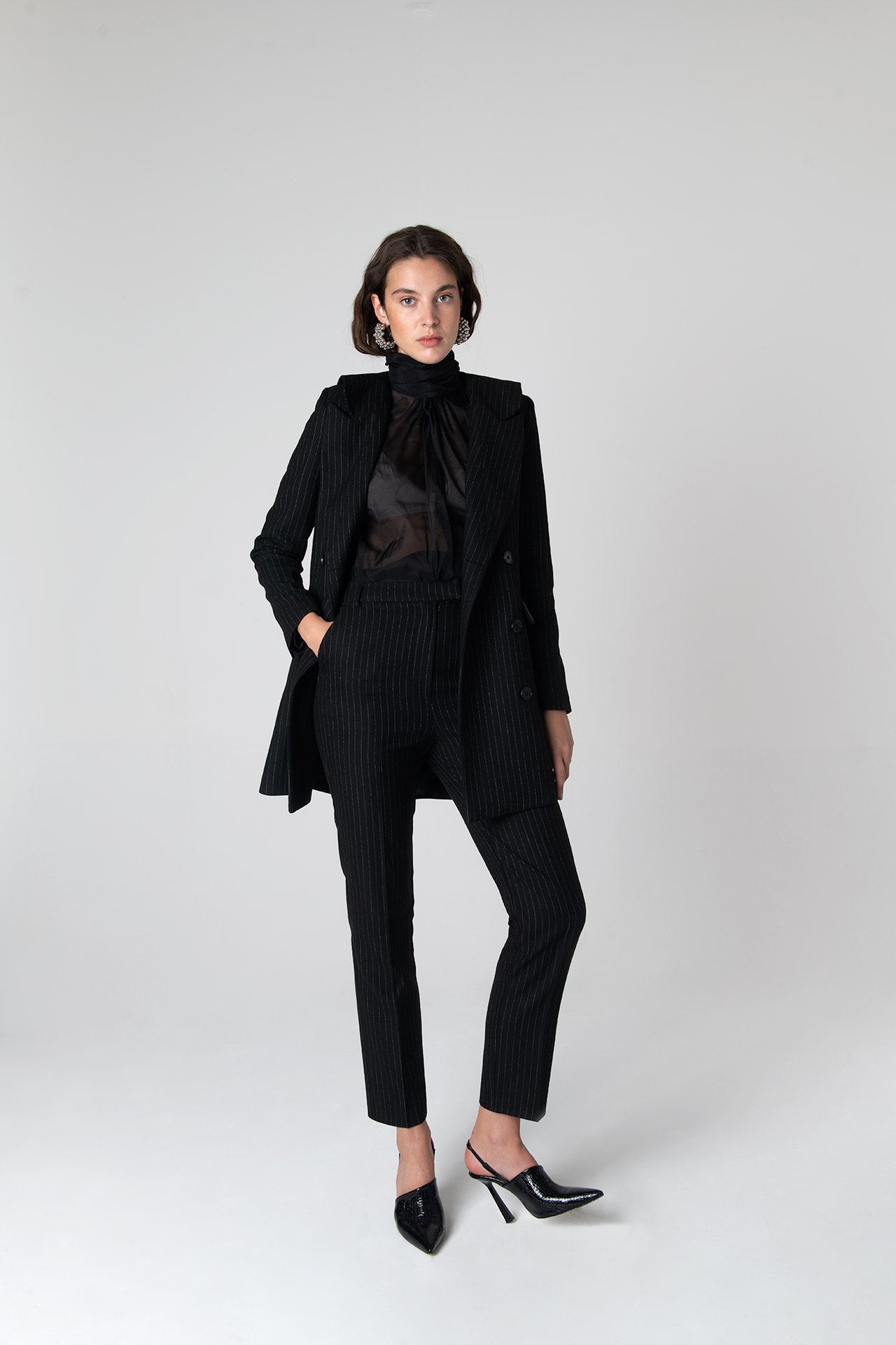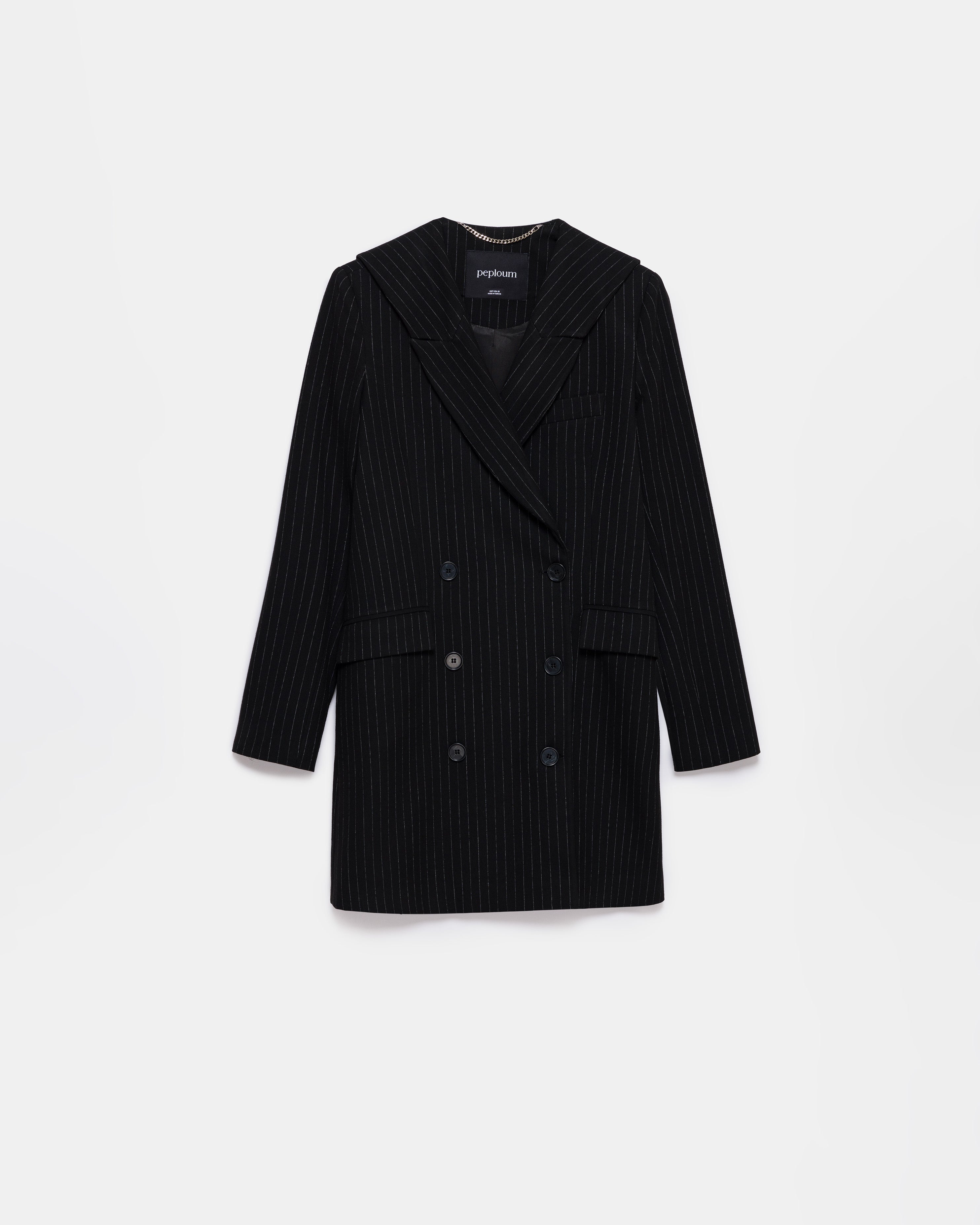 Kruvaze ceket elbise, hem elbise hem de ceket olarak kullanılabilir olması için tasarlanmıştır, bu sayede işlevselliği ön planda tutar. Feminen bir görünüm sağlayan vücuda saran kalıbı, yarı kırlangıç yakası ile tamamlanır ve arkada denizci yakasına dönüşür. Çizgili kumaş seçimi koleksiyonun temasına uygundur ve iki farklı renk seçeneği mevcuttur.